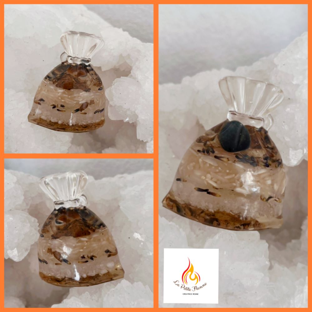 Sa composition en résine époxy , elle renferme des fleurs , herbes séchées , des épices et de l’Oeil de tigre et la magie de La Petite Flamme.